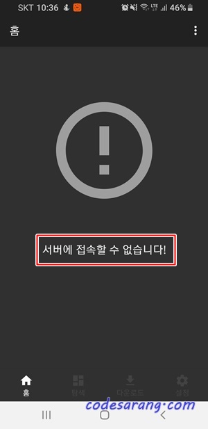 설치후 최초 실행 화면이다. 아래 그림처럼 "서버에 접속할 수 없습니다!"라는 메시지가 출력되고 아무것도 나오지 않는다.