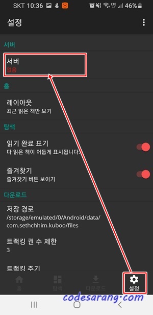 "설정" 메뉴로 이동, "서버"를 클릭한다.