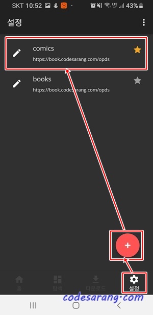 만약 만화책을 읽고 싶다면 위에서 처럼 만화책 새로 서버를 추가하여야 하며, 나의 경우 "https://book.codesarang.com/opds-comics/" 주소가 만화책용 OPDS 주소이다.