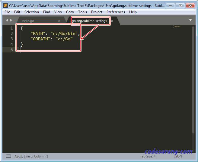 그러면, Sublime Text에 "golang.sublime-settings" 파일이 열리는데, 아래처럼 입력해 주도록 한다.