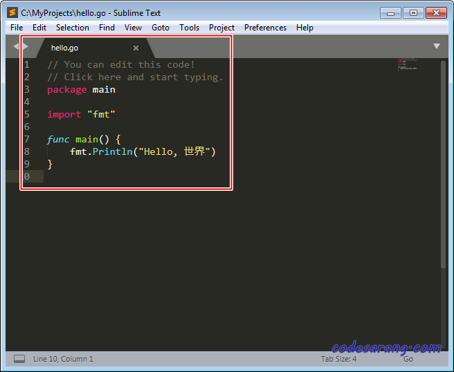 Sublime Text는 Go 언어뿐만 다양한 프로그래밍 언어를 편집하기 매우 편리한 도구이다. 우선, 아래와 같은 샘플 코드가 있다고 치자.