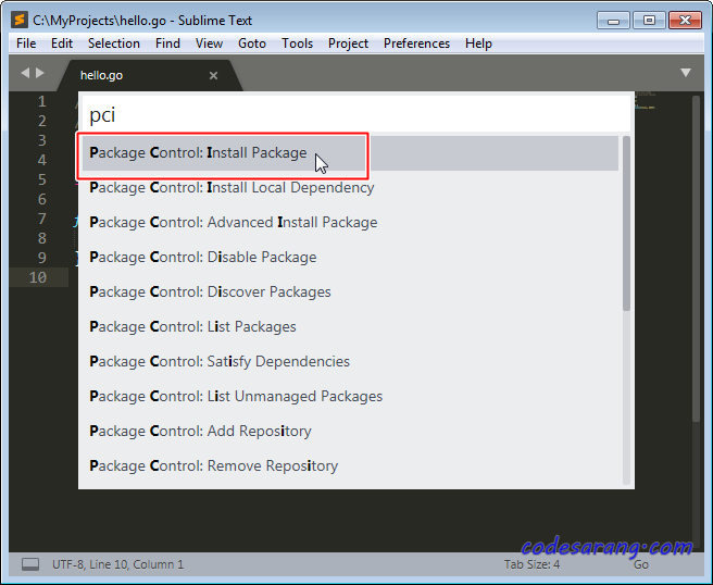 이제, Go 언어용 컴파일 패키지를 설치해 보겠다. Sublime Text에서 Ctrl+Shift+p 버튼을 "Command Palette..."를 실행한 후, "Package Control: Install Package"를 검색해 실행한다.