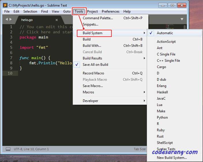 "Tools" 메뉴에서 "Build System"을 보면 아직은 Sublime Text에서 Go 언어를 지원하지 않는다.
