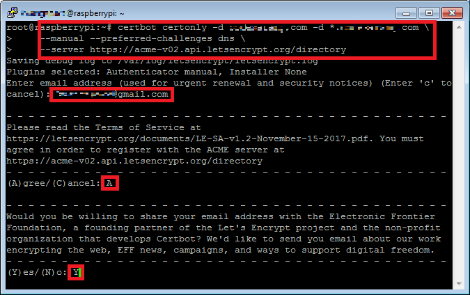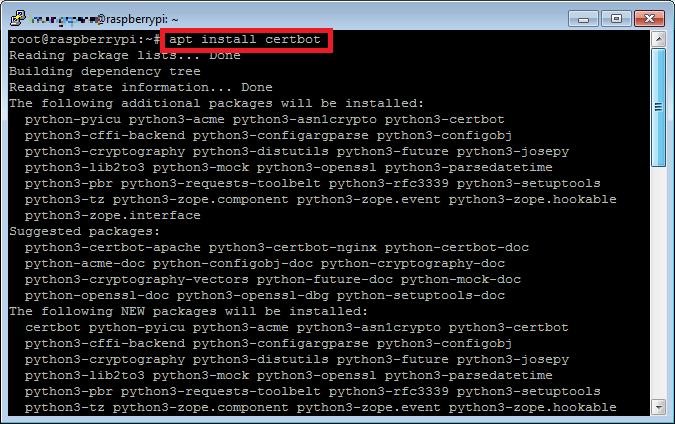 certbot은 Let's Encrypt의 SSL 인증서 확보를 위한 자동화된 도구이다. putty.exe를 이용하여 라즈베리파이에 SSH로 접속한 후 아래 명령을 이용하여 certbot 패키지를 설치한다.