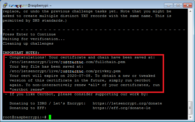 아래와 같은 메시지가 나왔다면 성공적으로 인증서를 발급받은 것이다. 혹시 그렇지 않고 에러 메시지가 발생했다면 TXT 레코드 추가 후 너무 빨리 엔터키를 쳤을 가능성이 높다.