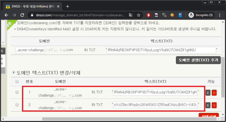 이럴 겨우 추가해논 TXT 레코드를 모두 삭제하고 처음부터 다시 시도해야 한다.
