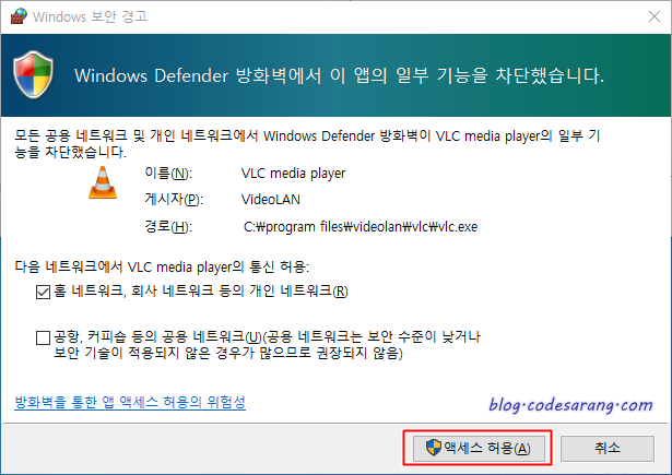 최초 접속시 아래와 같은 보안 경고가 나올 수 있는데 이럴경우 "액세스 허용" 버튼을 눌러 준다.