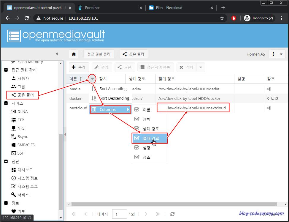 이제, "공유 폴더" 메뉴로 이동, "nextcloud" 폴더의 절대 경로를 확인하도록 한다. 절대 경로 확인을 위해서는 "Columns"에서 "절대 경로" 체크 버튼을 Enable 시켜 주도록 한다.
