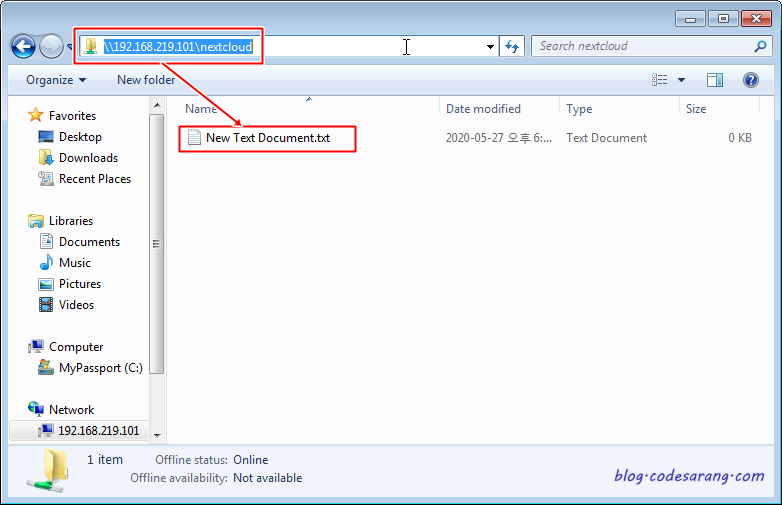 이제, 아래처럼 윈도우즈 탐색기로 새로 만든 공유 폴더로 접속한다. 차후 UID 및 GID 등 권한 확인을 위해 아무 파일이나 하나 생성하도록 한다.