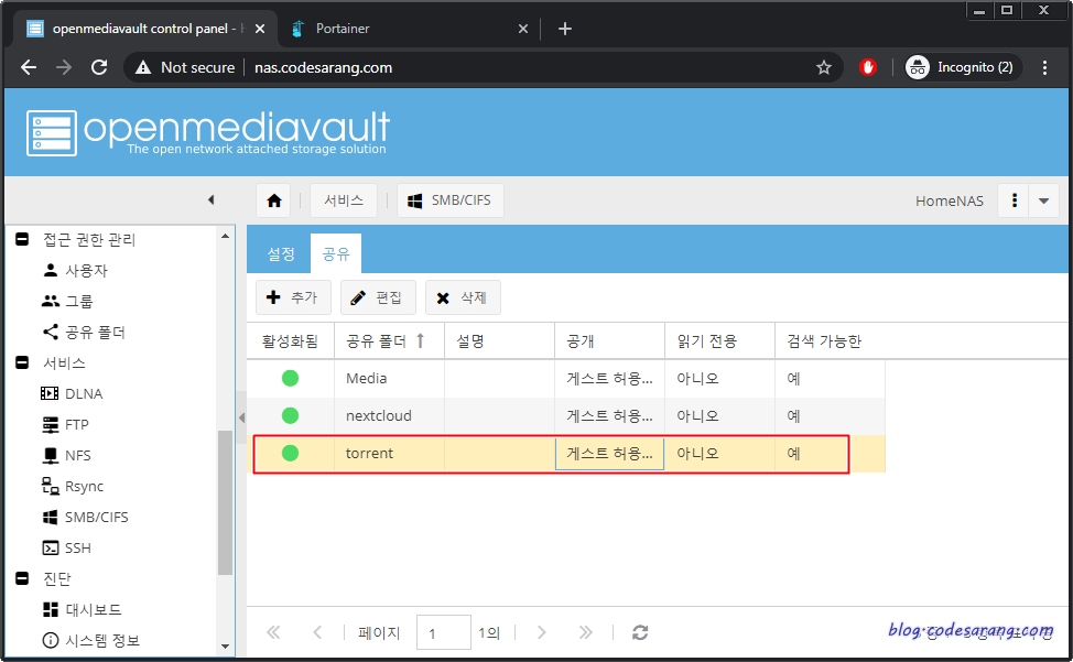 OMV5의 "SMB/CIFS" 메뉴에서 아래처럼 "torrent" 공유폴더를 추가하도록 한다.