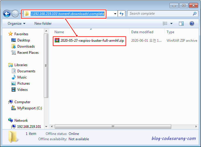 또는, 아래처럼 라즈베리파이 공유 폴더로 접속, "\torrent\watch" 폴더에 .torrent 파일을 복사해 놓기만 해도 토렌트 파일 다운로드가 수행된다.