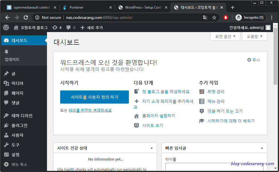 "꼬망토끼 블로그" 버튼 클릭 혹은 http://IP주소:8888 접속시 워드프레스 블로그 첫 화면을 볼 수 있다.