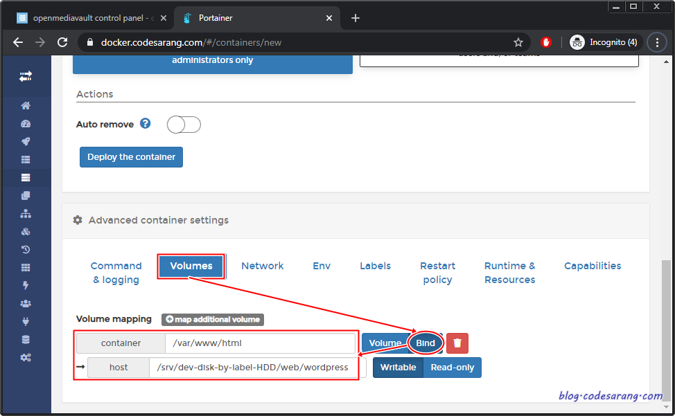 아래로 내려와 "Volumes" 탭에서 매핑할 볼륨을 선택한다. 지금 설치중인 wordpress docker 이미지의 경우 "/var/www/html"에 데이터가 저장되므로, 이 폴더를 호스트의 "/srv/dev-disk-by-label-HDD/web/wordpress" 폴더로 바인딩 해 준다.