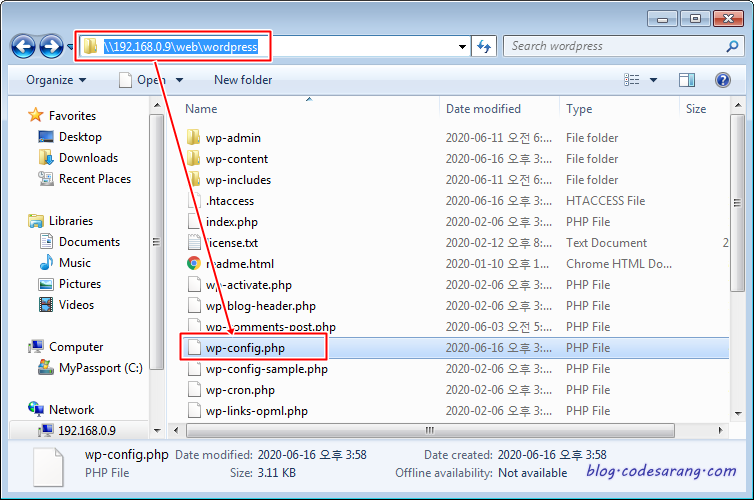 이제 윈도우즈 탐색기를 이용, 워드프레스 데이터 공유 폴더로 이동해 워드프레스 설정 파일인 "wp-config.php" 파일을 수정하도록 한다.